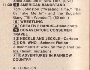 Other British Columbia papers we accessed included The Province, Times Colonist, Richmond Review, and Nanaimo Daily News. Unlike the two Vancouver titles, these usually printed schedules starting prior to 10am, and as such there were many episode listings not found in the two Vancouver papers. Only the Times Colonist printed story titles for a handful of episodes in 1979. For the most part, the listings just said "Dr Who".