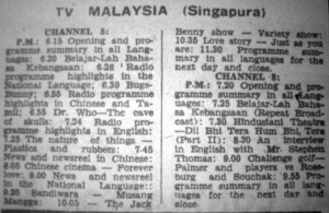 The Times used a number of different headings for the television station, such as SINGAPORE TELEVISION; TV MALAYSIA (Malaysia) & TV MALAYSIA (Singapura); TV SINGAPURA and TV SINGAPORE.) Another newspaper accessed was The Singapore Herald (which folded in the mid-1970s).