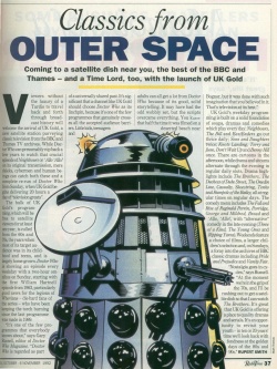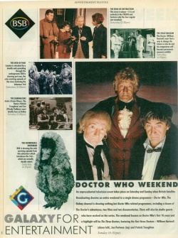 Doctor Who aired on the Galaxy channel of BSB, 1 April-1 December, 1990. A special Doctor Who weekend aired 22-23 Septebmer, 1990, presented in part by John Nathan-Turner and featured interviews with Sylvester McCoy, Carole Ann Ford, Elisabeth Sladen, Nicholas Courtney, William Russell, Gerry Davis and Raymond Cusick.