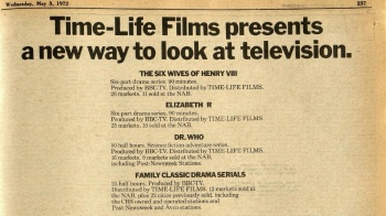 [[File:Broadcasting 3-4-72.JPG|right|300px|thumb|Time Life Films ad, 3 April 1972 - DR WHO in the sixth TV down]] | [[File:Broadcasting 3-4-72.JPG|right|300px|thumb|Time Life Films ad, 3 April 1972 - DR WHO in the sixth TV down]] | ||