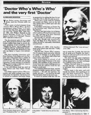 Doctor Who Who's Who was a New Jersey Network documentary hosted by Eric Luskin. First broadcast in 1985, it contained footage of Tom Baker on stage taken during the 11-12 February 1984 Creation Convention held in Philadelphia, plus other interview material conducted at other Creation conventions, and similar events.