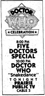 - 21 November 1987: The Five Doctors screens at 8.00pm (possibly a repeat?). The station is also screening regular episodes at 10.00pm. Snakedance airs that same evening.