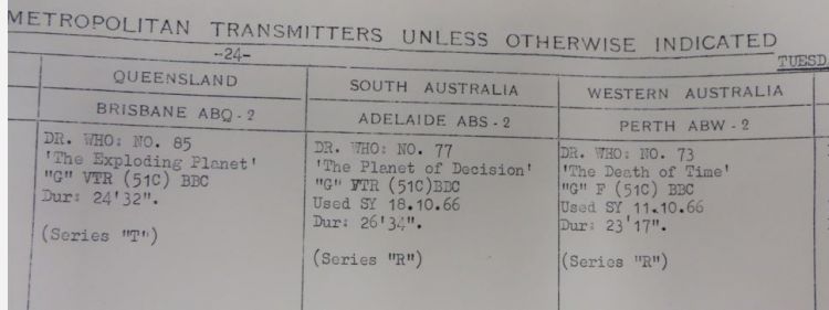 Most other series shown on the ABC at this time were stand-alone which meant the episodes could be played in any order, and thus only one set of film prints was required, but Doctor Who was almost unique because of its multi-part serialised nature, and so it was necessary to carefully pre-plan the schedules accordingly.