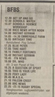 | 00:39, 17 March 2019 | DutchBBC1985.JPG (file) | 27 KB | BBC1 on Dutch TV, De Volkskrant 5 Jan 1985 | 1 | |