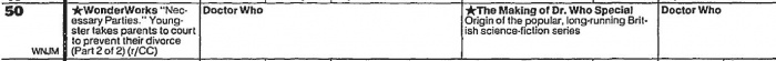 - 19 November 1988: Following a screening of The Five Doctors (7.00 to 9.00pm), Channel 50 screens "The Making of Doctor Who Special" (from 9.00 to 10.00pm), another of the specially-commissioned behind the scenes / interview specials produced by the Network. This one goes behinds the scenes during the making of Silver Nemesis. This was followed by another regular omnibus, from 10.00 till midnight.