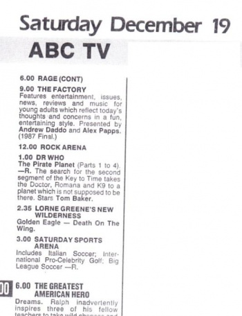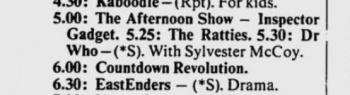 - During 1988, the ABC reviewed its policy towards the series; despite a virtually non-stop run (of new episodes and repeats) from February 1987 to July 1988, it was decided that with the next series, Doctor Who would no longer occupy a primetime early evening slot, and would instead be part of THE AFTERNOON SHOW, a children's cartoon / magazine programme that aired from 5.00 to 6.00pm five days a week.