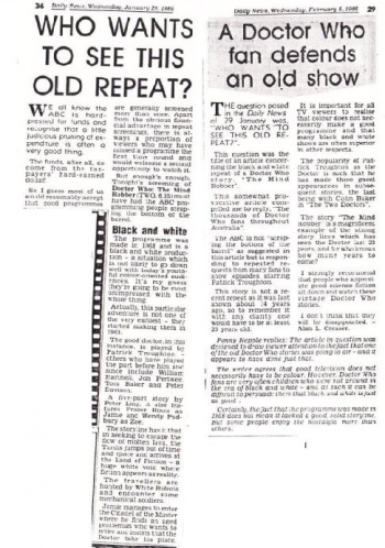 - A few days later, the Australian media programme Backchat featured letters from irate Doctor Who fans complaining about the missing episode not going to air. However, the show incorrectly identified the story as City of Death, even going as far as showing clips from that as compensation.