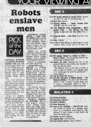 It was the Saturday Matinee on 5 March 1983, Channel 5, at 2.15pm. It was the "Pick of the Day" in the Straits Times, with the descriptor "Robots enslave men".