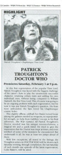 - 24 January 1987: The Trial of a Time Lord begins. NJN is one of the first US stations air this.