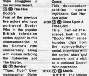 - 23 November 1983: The Five Doctors airs, followed by Once Upon a Time Lord.