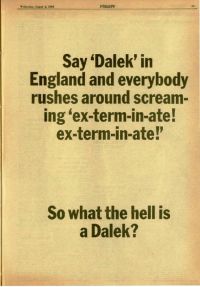 Both were broadcast for the first time in a widescreen format on a UK terrestrial station when Channel 4 aired the two in November 1994 and January 1995 respectively (with several more airings of each through until 2009). For these screenings of Daleks' Invasion Earth, the pre-credit 'robbery sequence' had been repositioned to come after the titles - an edit presumably made by the then-distributors, Lumiere Pictures (see below).