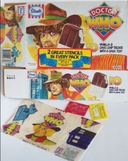 • Doctor Who iced confection – made by Streets in late 1981, these "Vanilla & Choc Chip Treats with a Choc Top!" came in wrappers featuring the fourth Doctor and K9, and each pack contained "2 great stencils / collect the set of 4". (Animated TV adverts for the iced lolly featuring the fourth Doctor and K9 aired on the commercial stations in early 1982, but not the ABC! See video below.)