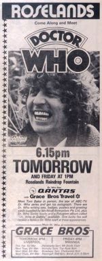 From 2 February 1979 until the end of the month, Tom Baker was in Australia on a publicity tour sponsored by the ABC. He did press, TV and radio interviews, plus book signings at various stores, such as the Grace Bros chain. On 12 February 1979 he made a surprise visit to Neutral Bay Public School in North Sydney; footage of his talk with the kids was later shown on the ABC.
