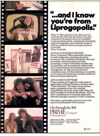 Starting in January 1980, and running for several months, commercials for Prime Computer of Australia Ltd (aka Prime Computer / Pr1me Computer) played at cinemas and aired on TV networks 7, 9 and 10. (Although it was the home of Doctor Who, the ABC could not show the adverts because it was a non-commercial station.)