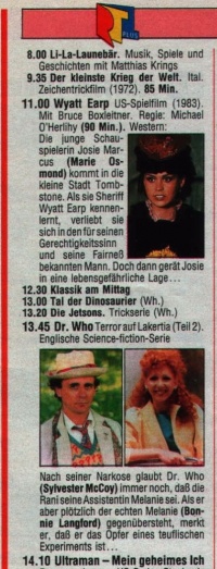 In a 22 November 1989 listing for the first episode of the "Neue Serie", it says the Doctor is a "Hexenmeister ... vom Planet Gallifrey", (a Witchmaster from Gallifrey!) who travels in time and space with Melanie and his "Roboterhund, "K9"!