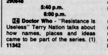 Jump to navigationJump to searchResistance is Useless (aka A Doctor Who Retrospective) was a 30 minute documentary made by the BBC's Late Show.