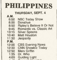 Doctor Who was aired by the FEN Philippines channels, commencing on Thursday, 10 April 1986, and concluded on 4 September 1986, at various timeslots, but usually starting around 1.40pm or 2.30pm.