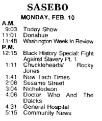 The first of the two films, "Dr Who and the Daleks" aired in Sasebo on Monday, 10 February 1986 from 3.04 to 4.31pm. It's highly likely the film also aired on the other stations in Japan (it aired on AFN-TV in Germany in 1985 – see below) but we did not locate those billings.