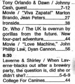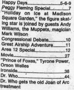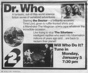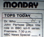 • 5 January 1976: The standard package of Jon Pertwee stories began in Boston on Monday 5 January, from 7.30 to 8.00pm. The TOPS TODAY and main billings both name the star as "John Pertwee". The main billing for the first episode also offers rather scathing comments about the quality of the BBC's special effects!