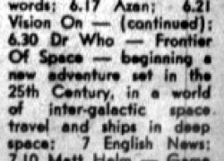 Brunei appears to have been the first country to screen Frontier in Space in colour. (The master tapes had been held by BBC Sydney since 1973; it wasn't until the mid-1980s that these master tapes were returned to BBC in London.)