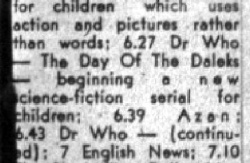 The newspaper listings stopped providing story titles from 3 September 1980, so it is unknown what stories the last 28 episodes were. This episode count equates to seven 4-parters, or two 6-parters (4S and 4Z?) and four 4-parters. The 11 March 1981 listing gives a timeslot of 5.30pm to 7.00pm – is this a misprint, or an indication that more than one episode aired?