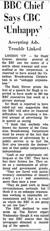The Canadian Press article referenced a London Daily Mirror article which printed the text of a speech that Sir Hugh gave to a private gathering of 200 BBC executives in the previous week (the Daily Mirror obtained a recording of the speech). Sir Hugh took an adamant line that the BBC would not relieve its financial burdens by selling advertising and brought up the example of the CBC in this regard who was referred to, but not in a vindictive manner, as an unhappy organization.
