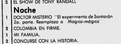 However, it is not clear how many stories or episodes played across that eight-week period, because the television listings printed by two different publications are contradictory and ambiguous. The two papers in question are El Tiempo and El Espectador (both of which also published weekly TV schedules in pull-out guides):