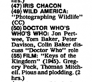 Doctor Who Who's Who was a New Jersey Network documentary hosted by Eric Luskin. It contained footage of Tom Baker on stage taken during the 11-12 February 1984 Creation Convention held in Philadelphia. Other interview material was conducted at other Creation conventions or similar events. Jon Pertwee's interview was conducted at his London home.