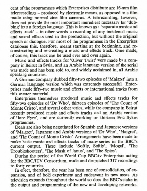 - ^ That Eddie moved onto the 1966 World Cup after his stint at Enterprises means his work on the M&E tracks would have been completed prior to July of that year (the 1966 World Cup was held from 11 to 30 July). That means the handful of early William Hartnell stories would have had their M&E tracks commissioned and completed probably during the second quarter of that year. BBC sales documentation records that the first sale of Doctor Who to a country that would have benefited from the newly-completed M&E tracks was for Venezuela, who aired Spanish dubs from February 1967; the first with Arabic dubs was Tunisia, from April 1967.