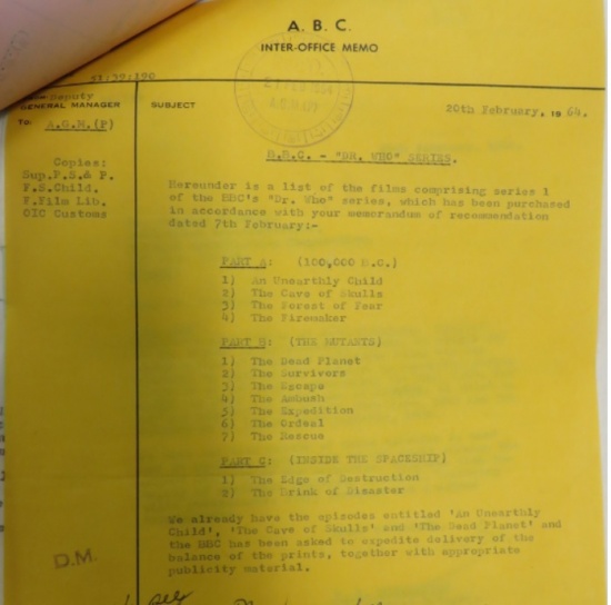 Australia confirms purchase of "Dr Who" on 20 February 1964: NOTE the story titles!