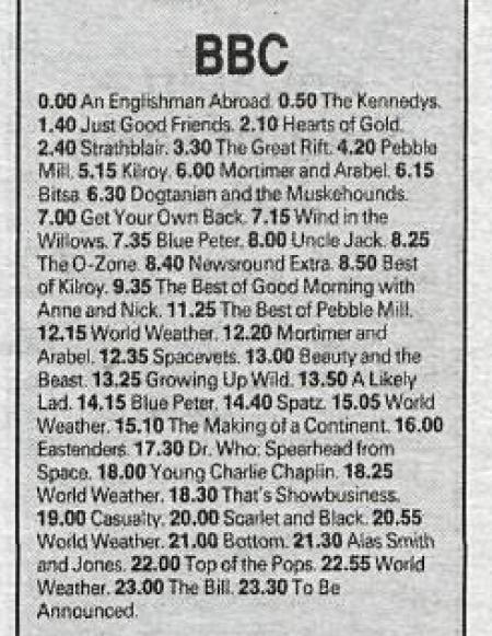 current01:38, 1 May 2012Thumbnail for version as of 01:38, 1 May 2012450 × 581 (71 KB)Jon Preddle (talk | contribs)BBC Prime TV listing, 28 Jan 1995