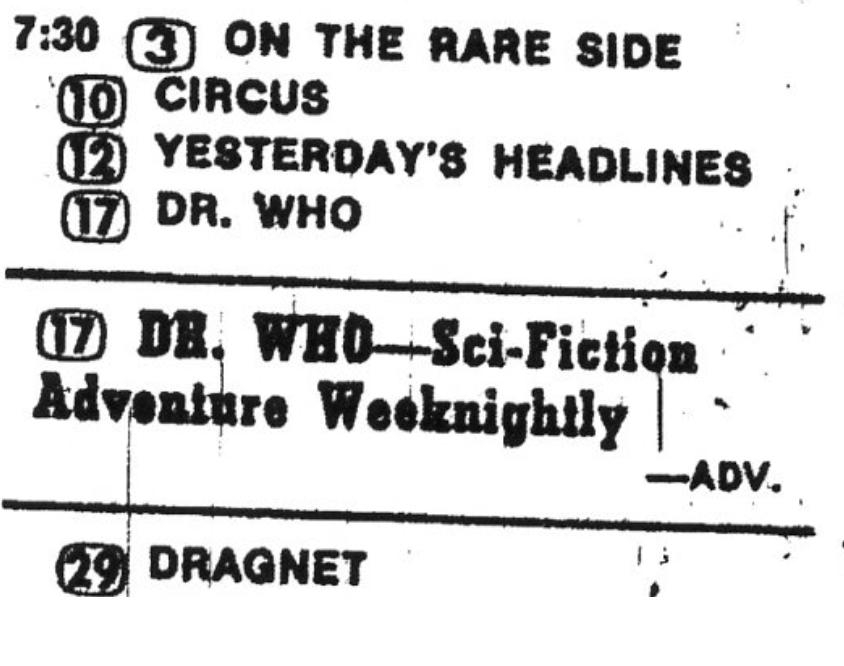 Listing for first ever Dr Who screening, Philadelphia Inquirer, August 1972.
