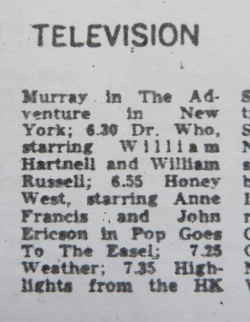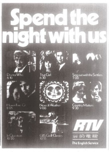The 23 April 1974 edition of the Hong Kong Standard featured a half page advertisement for RTV's English Service -- stating "Spend the night with us", and inside the first 'box' in the gallery of images was a publicity photo of Jon Pertwee.