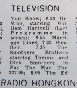 Only the Hong Kong Standard identifies the stories that aired in 1974, with "Carnival of the Monsters" [sic] given for all four parts of that story. The paper also incorrectly states that it stars "Bill Pertwee as the indestructible Dr Who"!