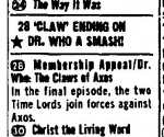 - 19 November 1977: The Daemons airs as a compilation with one intermission. A recording of this broadcast is used to colorize telerecordings for eventual VHS and DVD releases. Does this run feature the first American compilation broadcasts?