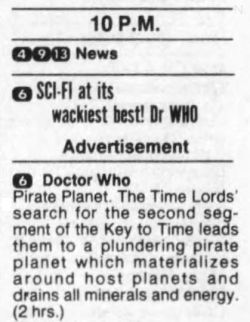 - 3 October 1987: Two runs of the Tom Baker stories begin, Saturday nights at 10:00 (although the first episode airs at 10:30). The TV Guide ad uses artwork provided by Lionheart.