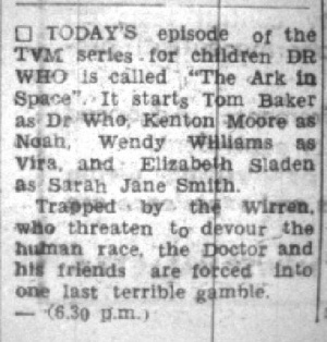 The Times gave the title as either "Dr Who" or "Doctor Who". None of the Hartnell episodes were identified by title, so the order is assumed. The 24 May 1965 issue had a short preview, saying: "DR WHO: A new series of space adventures for children, starting on MTV today at 6.30pm".