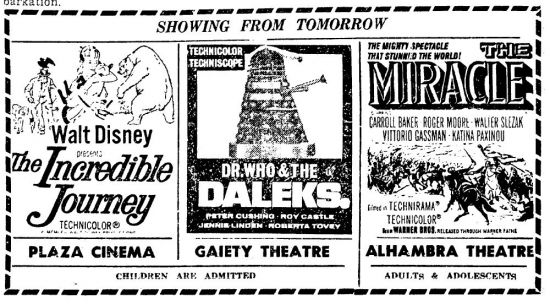 The first of the two Dalek movies played at the Gaiety Theatre from 16 April 1966. Coincidentally (?), The Dalek Invasion of Earth was showing on TV at the time.