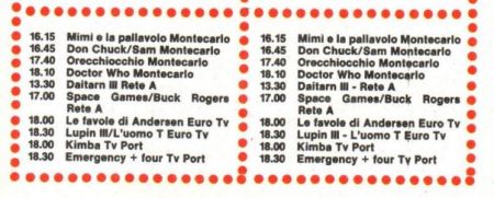 The 1984 repeat run info comes from the Corriere dei Piccolo, a children's magazine which features cartoon strips and articles about upcoming movies and TV shows, plus full week TV listings. There were no TV schedules in the last issue published for 1983, so the listings for the final two weeks of December 1983 are unknown. As noted above, the repeat run spans 27 dates, so there was presumably one day when Doctor Who didn't air; this was likely to be around Christmas or New Years.