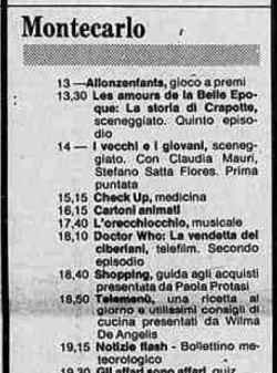 However, since the "Monaco" broadcasts of Doctor Who were actually coming from Italy, it is very likely that the "sale" to Monaco is included in the sale to Italy – which the 1987 memo from The Eighties - THE LOST CHAPTERS records as "(9)" stories, although only seven aired. (See the profile on Italy for more on this anomaly.)