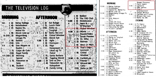 TV listings for the 1970s have been obtained from the Bulletin Today and Philippines Daily Express. The 1989 listings are from the Philippines Journal and the online archived editions of the Manila Standard.