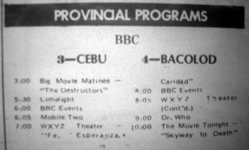 In the 1970s, Doctor Who was screened by ABS-CBN on (at least) three of the islands: on Luzon, from Quezon City (Channel 2 – also known as BBC2, not to be confused with the British channel!); on Negros, from Bacolod (the capital of the Negros Occidental province) (Channel 4 / BBC4); and on Cebu, from Cebu City (Channel 3). (The series may well have aired on the other islands, but we don't have those airdates.)