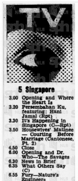 The Times used a number of different headings for the television station, such as SINGAPORE TELEVISION; TV MALAYSIA (Malaysia) & TV MALAYSIA (Singapura); TV SINGAPURA and TV SINGAPORE.) Another newspaper accessed was The Singapore Herald (which folded in 1971).