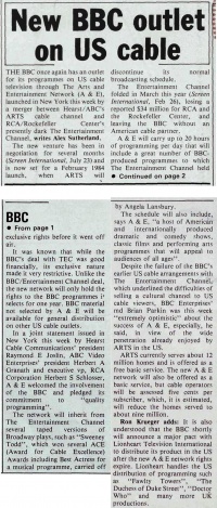 - The Entertainment Channel was shut down on March 31, 1983 and merged with Alpha Repertory Television Service (ARTS) to form the Arts & Entertainment Network (A&E). A&E launched February 1, 1984 with programs from ARTS (The Associates) and TEC (Solo), but not Doctor Who.
