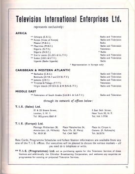 TIE (Sales) was the representative for the TV stations in the 13 countries listed above, plus numerous other radio stations within the USA, the Caribbean and Africa, such as Uganda, Malawi and Tanganyika (see the WRTH advertisements below).