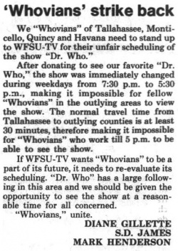 - 9 October 1982: A Saturday night run of complations begin. Doctor Who will air six nights a week for most of its run on WFSU.