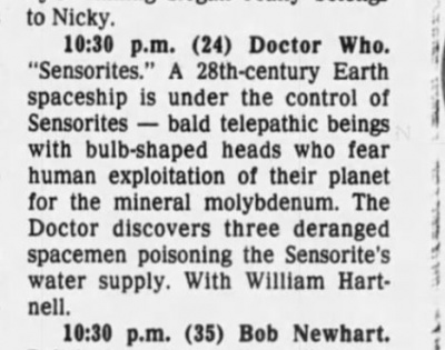- Compilation: The Doctor tries to free the crew of a 28th-century spaceship from the control of an alien race known as the Sensorites.