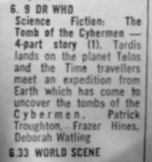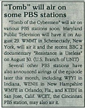 - In DWM #170 (published January 1991) it is reported that a fan "claims to have seen The Tomb of the Cybermen in the Far East in 1978. The sparse details, which included transmission date, have been passed onto the BBC Archives". This claim was of course false -- however, later that same year...