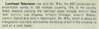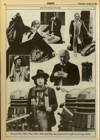 • 29 October 1986: On the fiftieth anniversary of BBC Television, BBC Enterprises takes out a 7-page ad in the industry publication Variety. Doctor Who gets an entire page (see below).