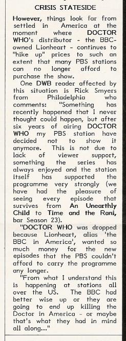 - By the end of the year, more and more PBS stations are dropping the series because it is becoming too expensive, and Lionheart is forcing them to purchase the Tom Baker stories again as part of the package of fresh episodes. As a consequence, the McCoy stories do not sell as widely as those of the other Doctors.